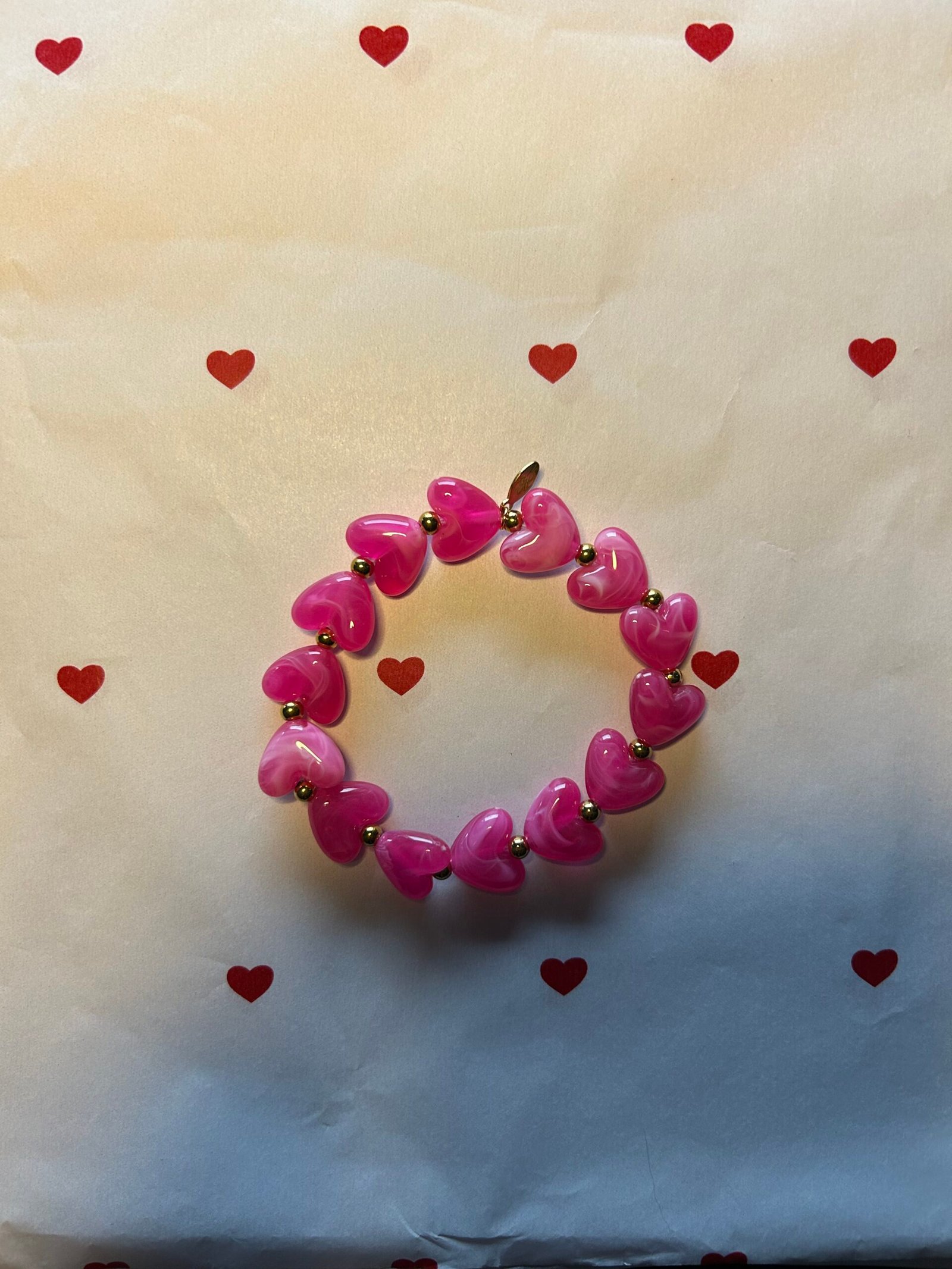 Deze roze hartjes armband is echt zo’n armbandje dat meteen opvalt door de vrolijke kleur en de lieve uitstraling. De glanzende hartjes worden afgewisseld met kleine goudkleurige kraaltjes, waardoor het geheel een speelse en warme look krijgt. Perfect om je outfit net dat beetje extra kleur te geven.